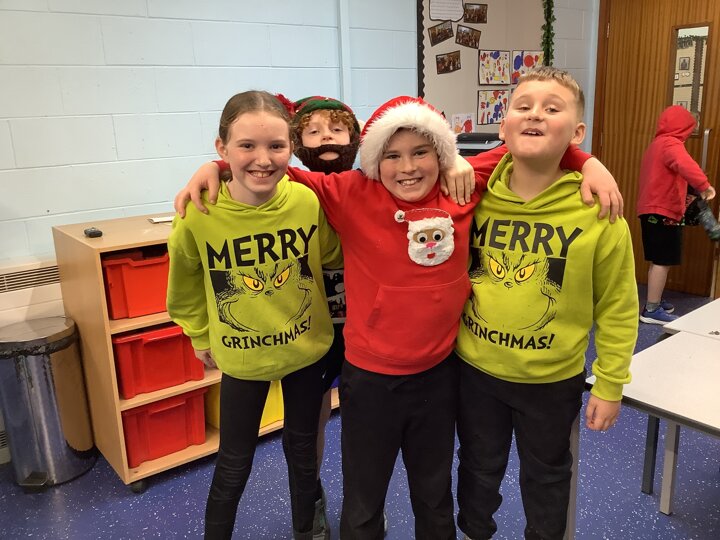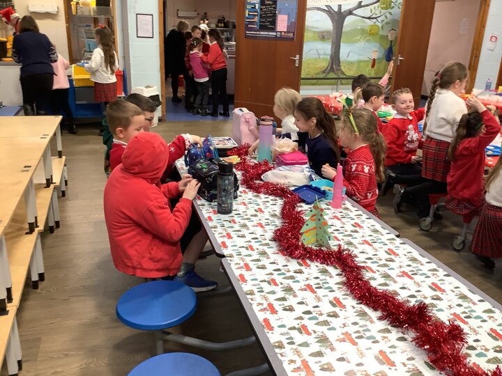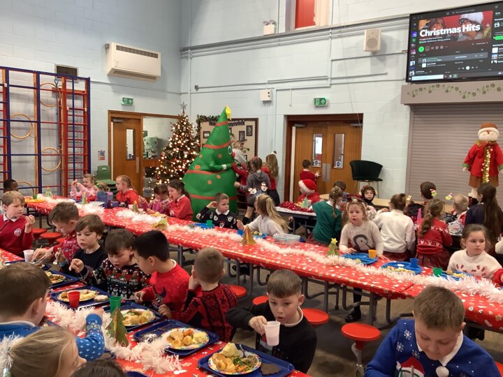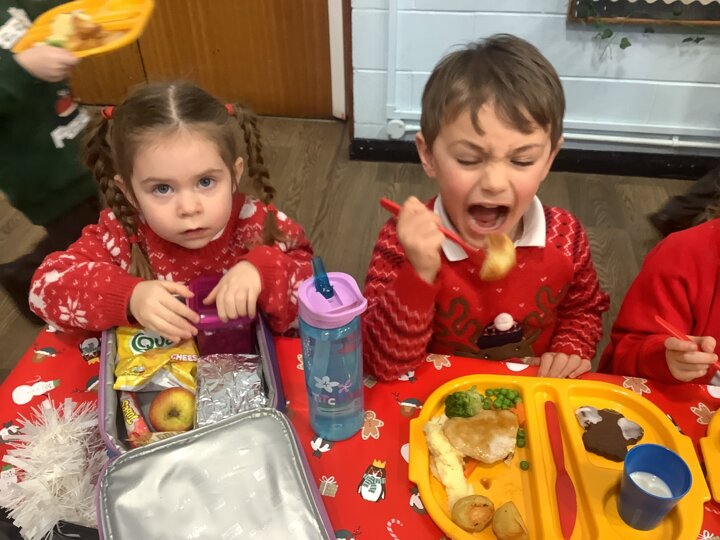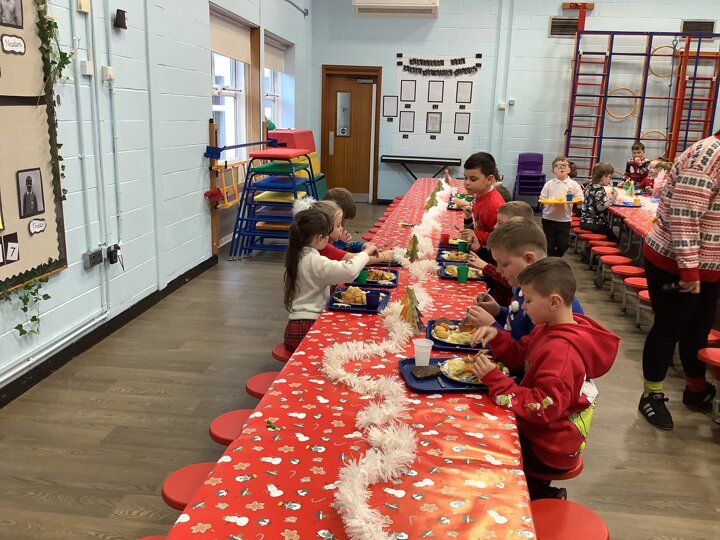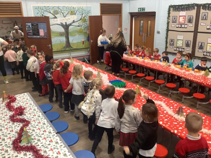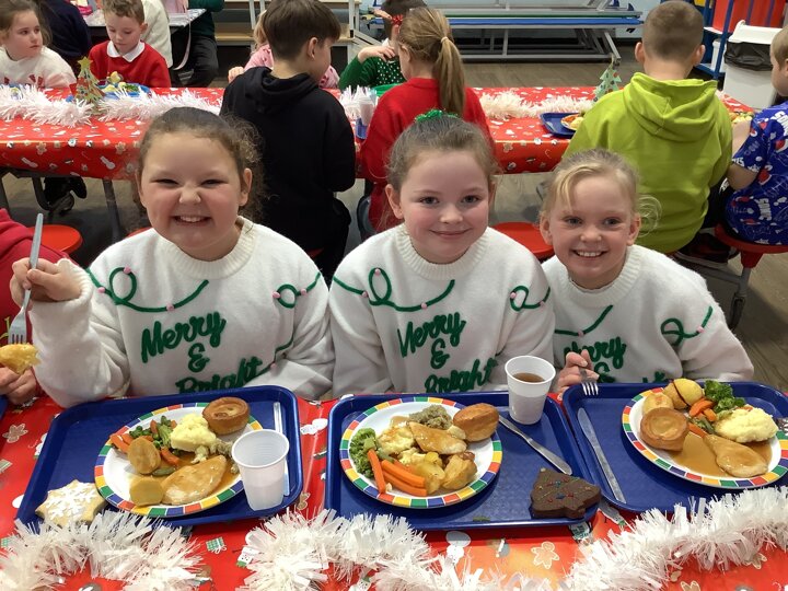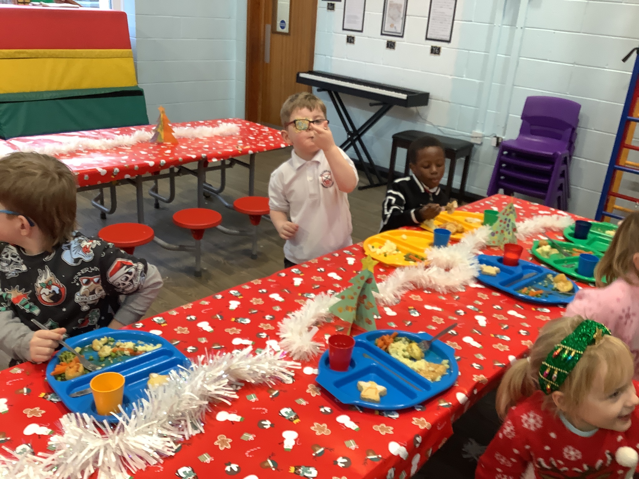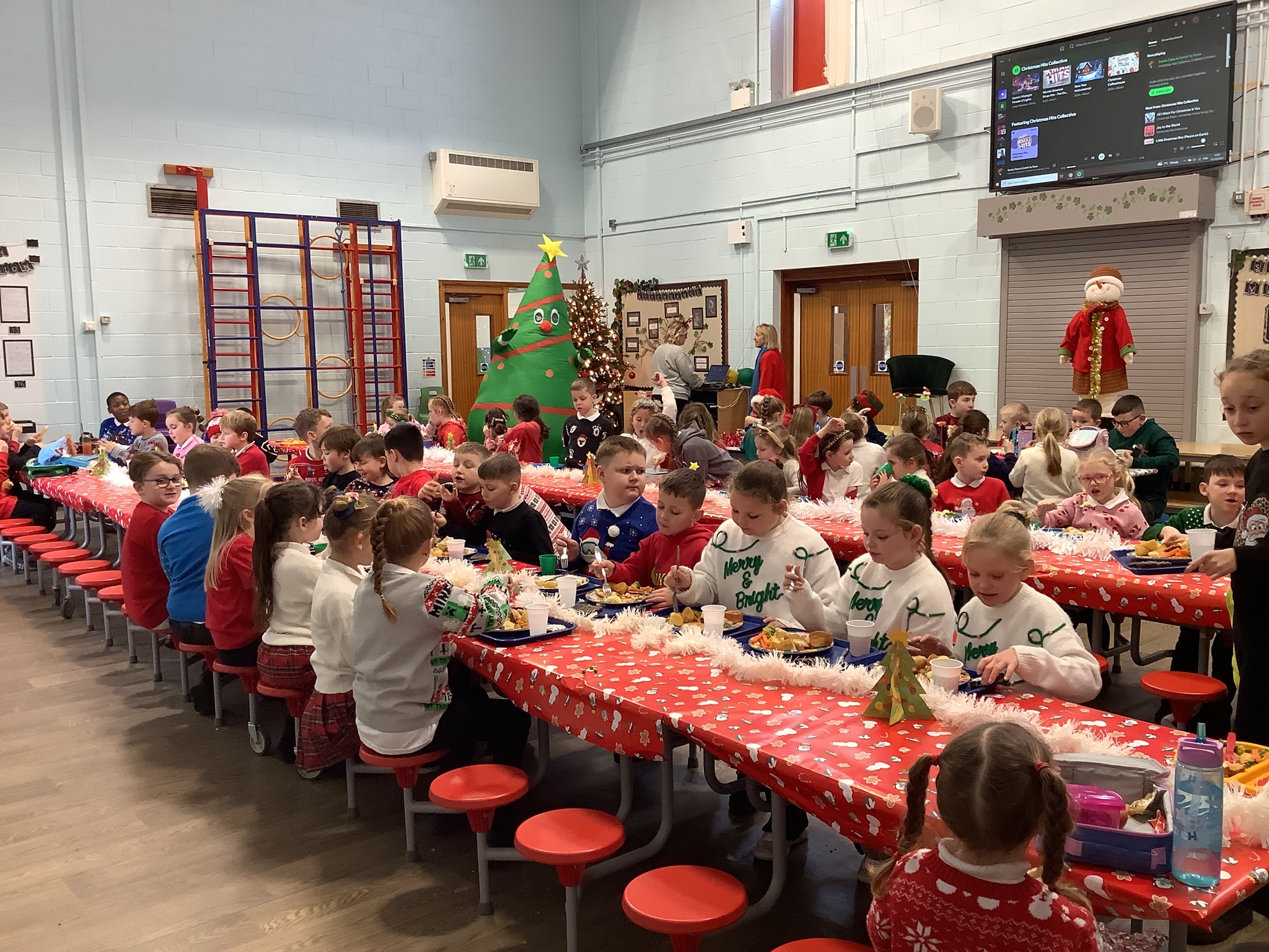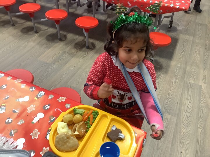 Our school was filled with festive cheer as children enjoyed a wonderful Christmas dinner together. The hall was transformed for the occasion, with tables wrapped in colourful wrapping paper and beautifully decorated to create a truly Christmassy atmosphere.